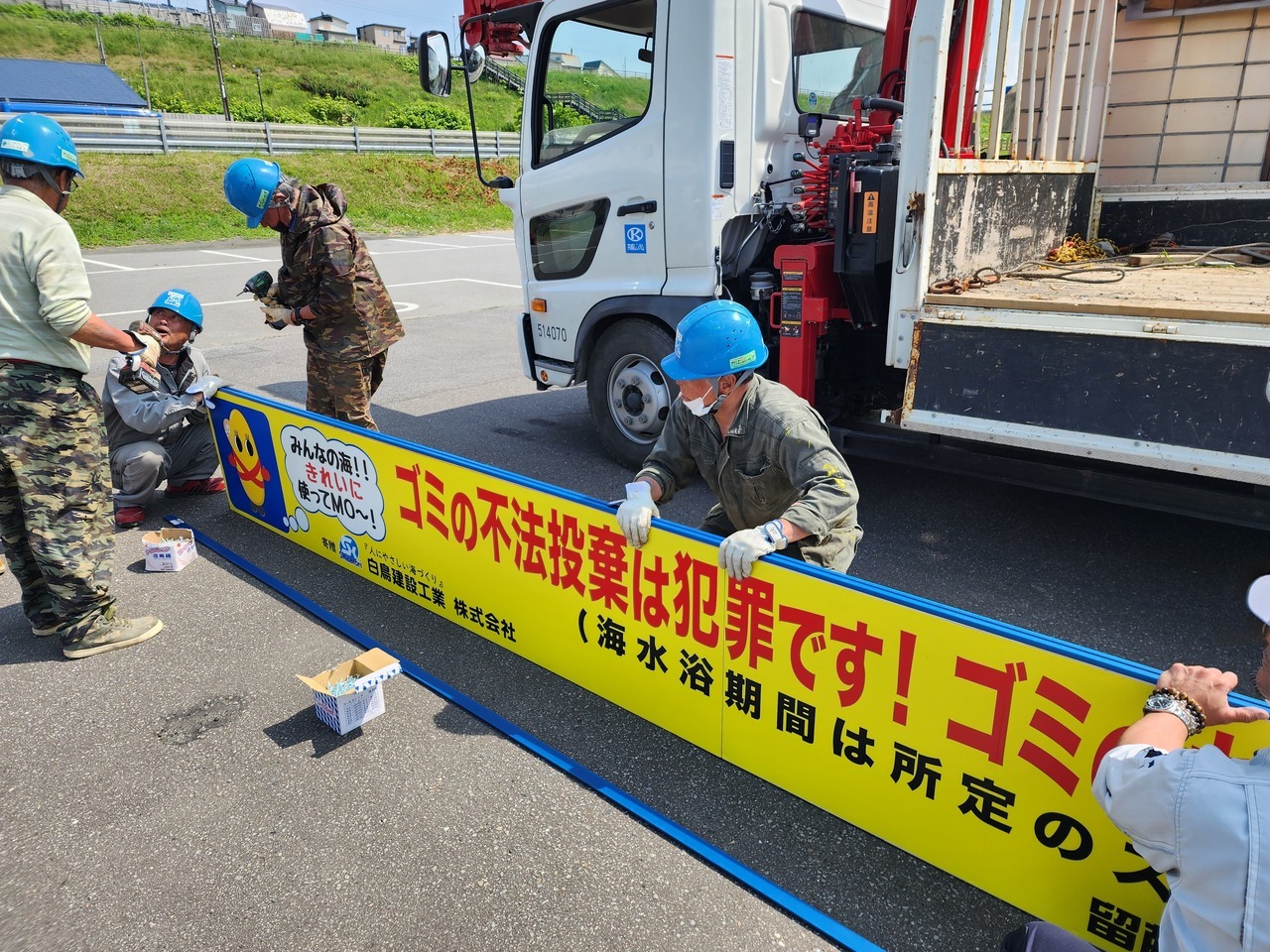 2023年6月16日に地域貢献活動として、長年使用(10年程使用)より、経年劣化が見受けられていたゴールデンビーチるもい南側管理棟のゴミ注意喚起看板を、新しい看板に取り換えました。看板には、留萌市キャラクターのかずもちゃんからのお願いとして『ゴミの不法投棄は犯罪です! ゴミのお持ち帰りにご協力下さい。!!』とのメッセージ看板として設置しました。 後日、7月6日に留萌市長中西俊司様より感謝状を頂きました。